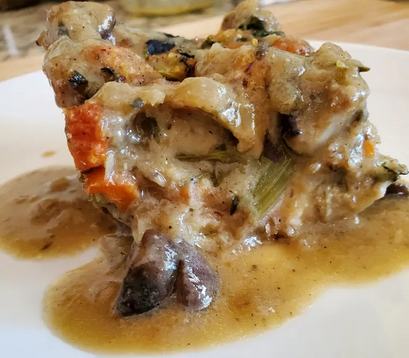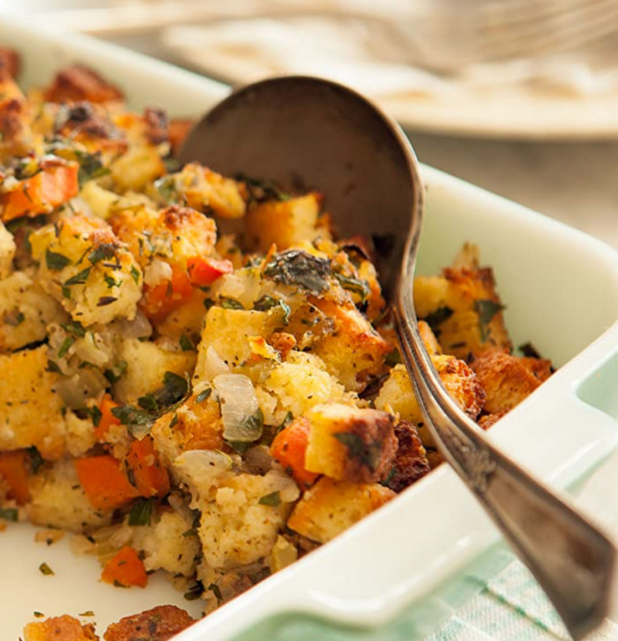 Lightly coat a 9×13-inch baking dish with olive oil or butter. In a large bowl, combine vegetable mixture with bread cubes, chicken broth and parsley. If the bread you are using is thicker or drier and you want a softer stuffing consistency, you can add 1/3 cup more chicken broth if needed. Transfer to the prepared baking dish and bake until hot throughout and golden brown, about 30 minutes. Yum!!!